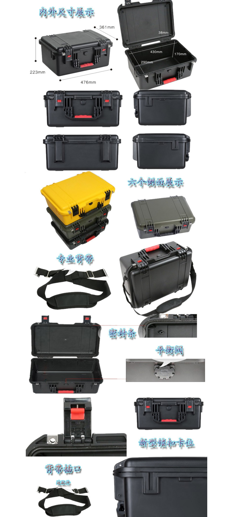 簡(jiǎn)要說(shuō)明:廣泛用于傳媒、公安、消防、軍隊(duì)、航空、戶外攝影、野外考察、科學(xué)探測(cè)等眾多領(lǐng)域的高端儀器、儀表。具有高強(qiáng)度、高抗壓沖擊、防潮、絕對(duì)密封、防塵、防水等特點(diǎn)。產(chǎn)品材質(zhì):ABS原料,箱體采用高抗沖擊的高分子聚合材料一體注塑成型,密封采用扁型彈性發(fā)泡密封橡膠條,確保防水氣密,所有較軸均采用不銹鋼材質(zhì)。